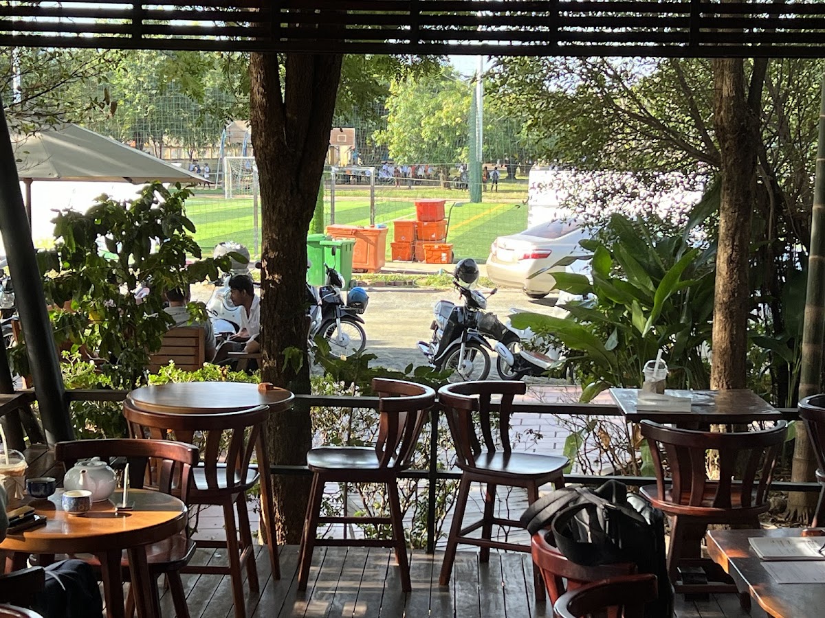 The café features an open, airy terrace shaded enough to enjoy Cambodia’s often warm and humid climate without feeling confined. This outdoor seating area seems to be where most people like to settle in, especially in the mornings or late afternoons, taking their time with an iced latte or a hot latte while catching up with friends or quietly watching the town go by. The moderate noise level suggests a casual hum of conversation rather than a loud café crowd, making it a suitable spot for those who want to unwind without total silence.